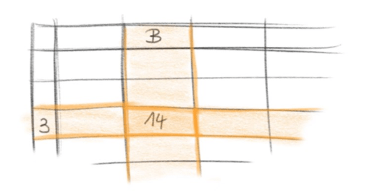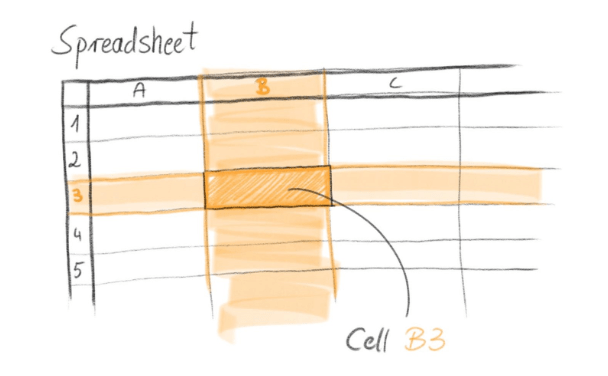 Tabellenkalkulationen bestehen aus einem Raster von Zellen, die in Spalten und Zeilen angeordnet sind. Spalten werden üblicherweise mit Buchstaben in alphabetischer Reihenfolge benannt, beginnend mit „A“, gefolgt von „B“, „C“, „D“ usw. Zeilen werden numerisch benannt („1“, „2“, „3“, …). Ein Beispiel für eine Zelle in Spalte „B“ und Zeile „3“ wäre „B3“.