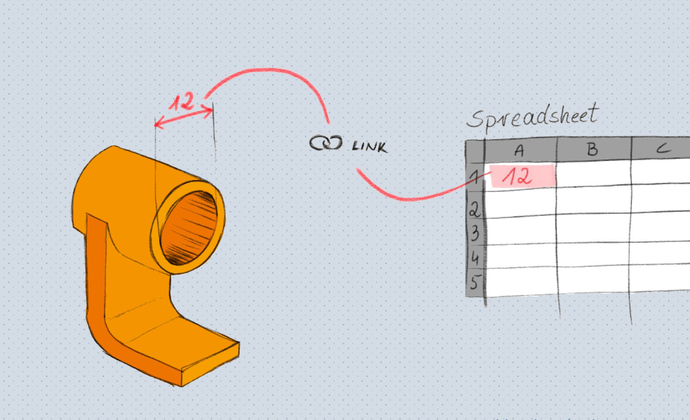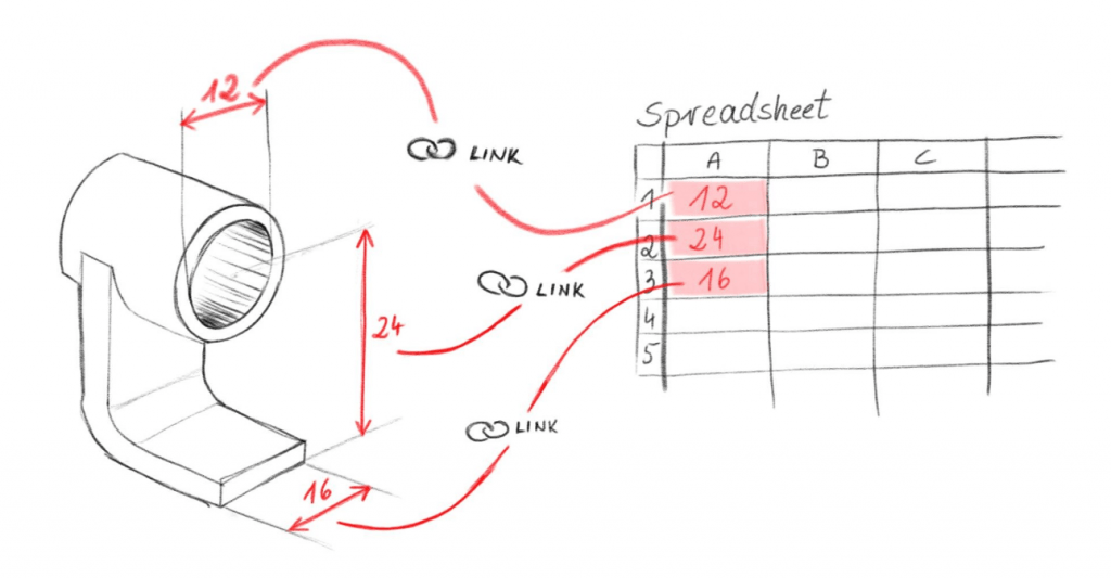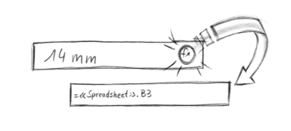 Jede Zelle in einer Tabellenkalkulation kann einen Wert enthalten. Eine Bemaßung in einer Skizze kann mit dem Wert einer Tabellenzelle verknüpft werden (zum Beispiel mit der Zelle „C7“).