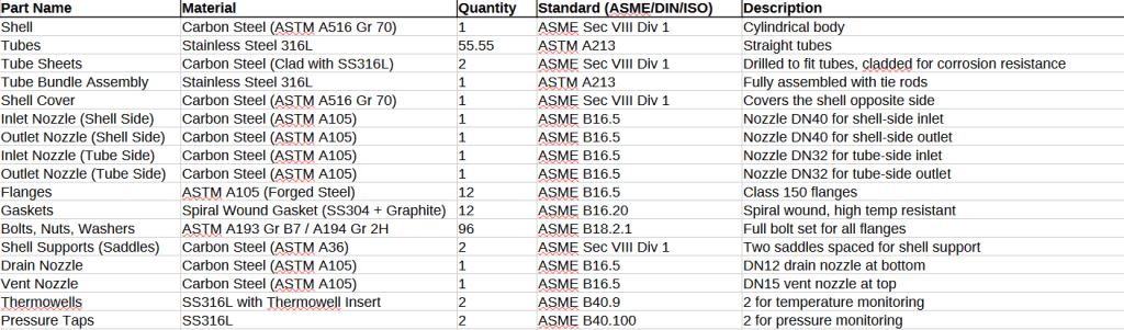 Der Rohrbündelwärmetauscher besteht aus mehreren zentralen Komponenten, die jeweils gemäß den ASME Richtlinien ausgelegt und gefertigt werden, um Zuverlässigkeit, thermische Leistungsfähigkeit und Betriebssicherheit sicherzustellen. Die Werkstoffauswahl erfolgt auf Basis von Festigkeit, Korrosionsbeständigkeit, Wirtschaftlichkeit sowie Eignung für hohe Temperaturen und Drücke.