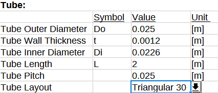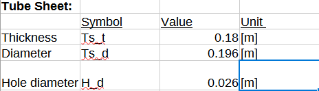 Abbildung 10: Rohrbündelwärmetauscher im oberen Bereich und Parameterdarstellung in der unteren Tabelle aus LibreOffice Calc