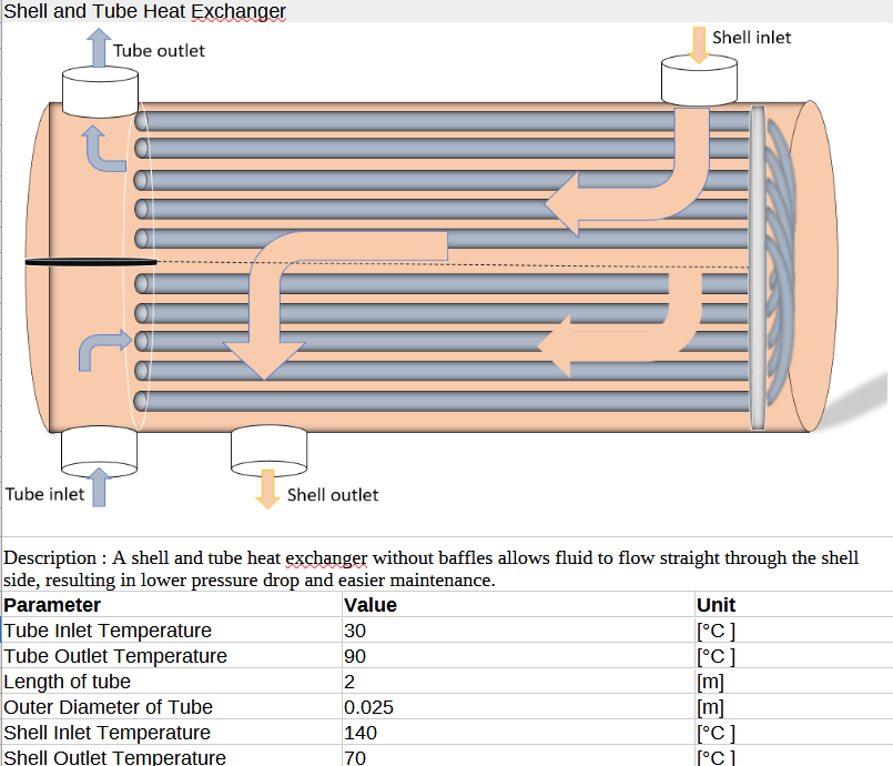 Die Auslegung gewährleistet eine Erwärmung des Rohrseitenfluids von 30 °C auf 90 °C sowie eine Abkühlung des Mantelfluids von 140 °C auf 70 °C, wodurch die erforderliche Wärmeleistung erreicht wird. Die Verwendung gerader Rohre vereinfacht die Konstruktion und reduziert den Wartungsaufwand, führt jedoch im Vergleich zu Konstruktionen mit Umlenkblechen zu einer geringeren Wärmeübertragung.