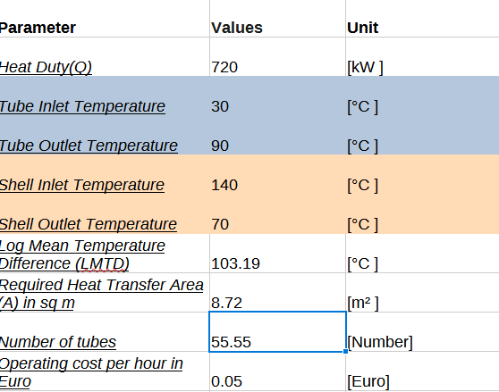 Der Wärmetauscher wurde nach dem LMTD Verfahren ausgelegt, das die entlang der Wärmetauscherlänge variierende Temperaturdifferenz zwischen heißem und kaltem Fluid berücksichtigt. Die berechnete Wärmeleistung beträgt 720 kW bei den genannten Temperaturänderungen. Mit Hilfe der LMTD Formel ergibt sich eine effektive Temperaturdifferenz von 103,19 °C. Die erforderliche Wärmeübertragungsfläche beträgt 8,72 m², was etwa 56 Rohren mit einer Länge von 2 m und einem Außendurchmesser von 0,025 m entspricht. Die Betriebskosten des Wärmetauschers betragen unter Annahme typischer Energiepreise etwa 0,05 Euro pro Stunde.