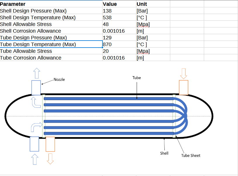 Die gewählten Auslegungsparameter für Temperatur und Druck erhöhen die strukturelle Festigkeit des Wärmetauschers und gewährleisten einen sicheren Betrieb unter anspruchsvollen Prozessbedingungen. Die zulässigen Spannungen werden auf Basis der Materialkennwerte gemäß den ASME Auslegungsrichtlinien bestimmt. Für Mantel und Rohrseite wurde ein Korrosionszuschlag von 1 mm berücksichtigt, um Materialabtrag über die Betriebsdauer auszugleichen und die Lebensdauer zu verlängern.