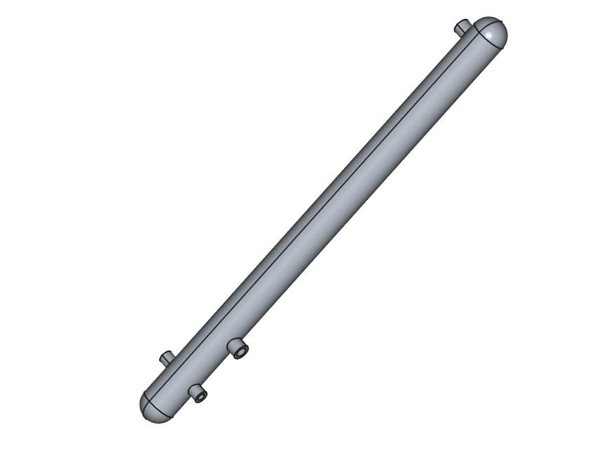 Das Modell wurde mit FreeCAD konstruiert. Die Gesamtabmessungen betragen Durchmesser Φ6,4 mm, Wandstärke 3 mm und Länge 250 mm. Vier Anschlussstutzen sind vorhanden für Ein und Auslass von Rohr und Mantelseite.