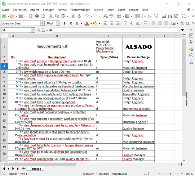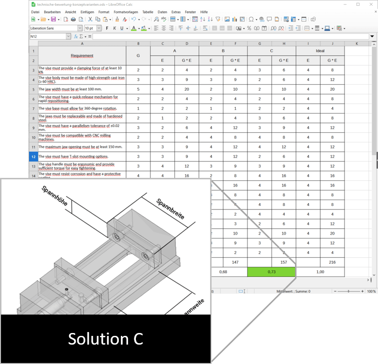 Abbildung 1: Anforderungsliste eines Maschinenschraubstockes in LibreOffice Calc