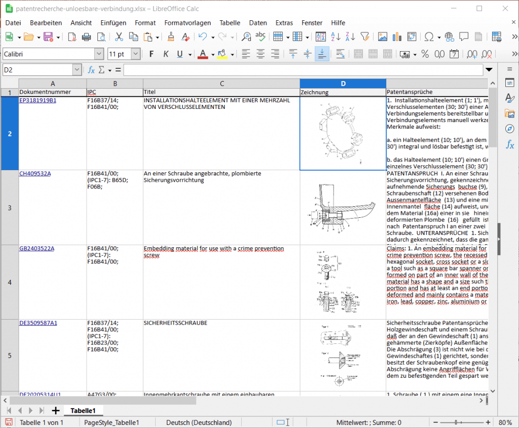 Abbildung 4: Zusammenstellung der relevantesten Erfindungen in LibreOffice Calc zu einer Sicherheitsschraube aus der Patentdatenbank