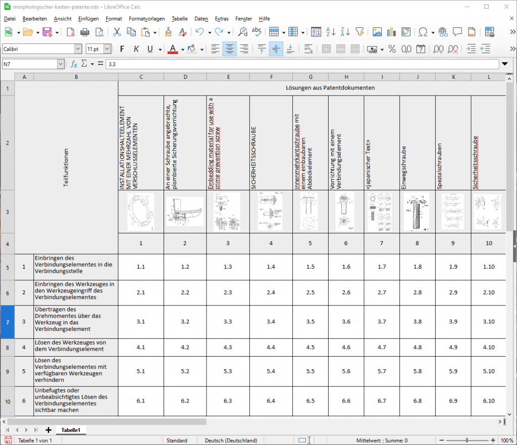 Abbildung 5: Morphologischer Kasten der Lösungen des der Patentrecherche und der Produkt-Teilfunktionen in LibreOffice Calc