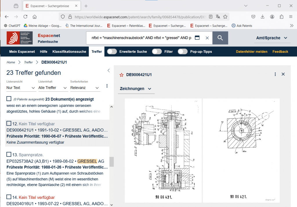 Abbildung 3: Gefilterte Ergebnisse von Patentdokumenten aus der Patentdatenbank auf Espacenet mit 23 Treffern