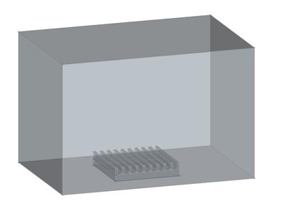 Das Modell ist für eine CFD Analyse in eine Rechendomäne eingebettet und wurde in FreeCAD konstruiert. Die Abmessungen der Rechendomäne betragen 150 mm × 100 mm. Der rechteckige Lamellenkühlkörper besitzt Abmessungen von 50 mm × 50 mm. Die einzelnen Lamellen haben Abmessungen von 50 mm × 1,5 mm und sind im Abstand von 5 mm zueinander angeordnet.