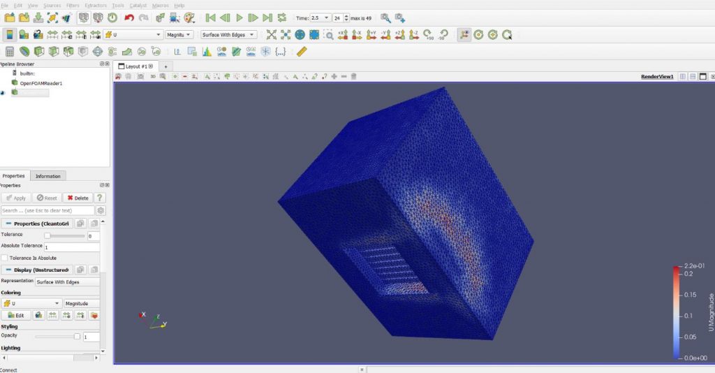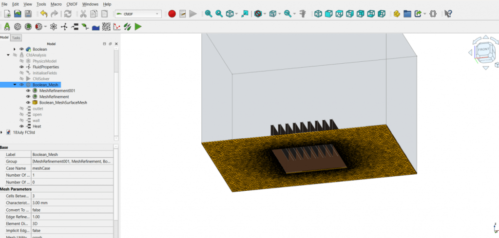 Die CFD Analyse der Luftströmung über den Kühlkörper wurde im CFD Modul von FreeCAD mit OpenFOAM als Solver durchgeführt. Da Luft als inkompressibles Fluid modelliert wurde, kam ein druckbasierter Solver zum Einsatz. Ein stationäres laminare Strömungsmodell wurde gewählt, da die Reynoldszahl im laminaren Bereich liegt und somit keine Turbulenzmodelle erforderlich sind.