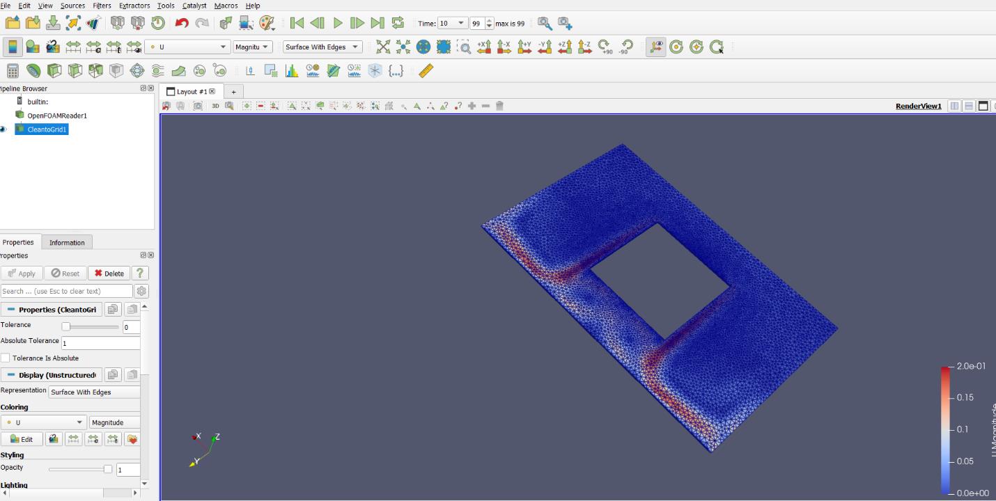 Die Initialisierung des Strömungsfeldes erfolgte mit der Einlassgeschwindigkeit und einem Referenzdruck von null. Es wurden bis zu 2000 Iterationen durchgeführt, wobei alle 100 Schritte Ergebnisse gespeichert wurden. Die Simulation lief parallel auf vier Prozessoren, wodurch sich die Rechenzeit reduzieren ließ. Ein Zeitschritt von 0,001 Sekunden sowie eine maximale CFL Zahl von 5,0 stellten die numerische Stabilität sicher.
