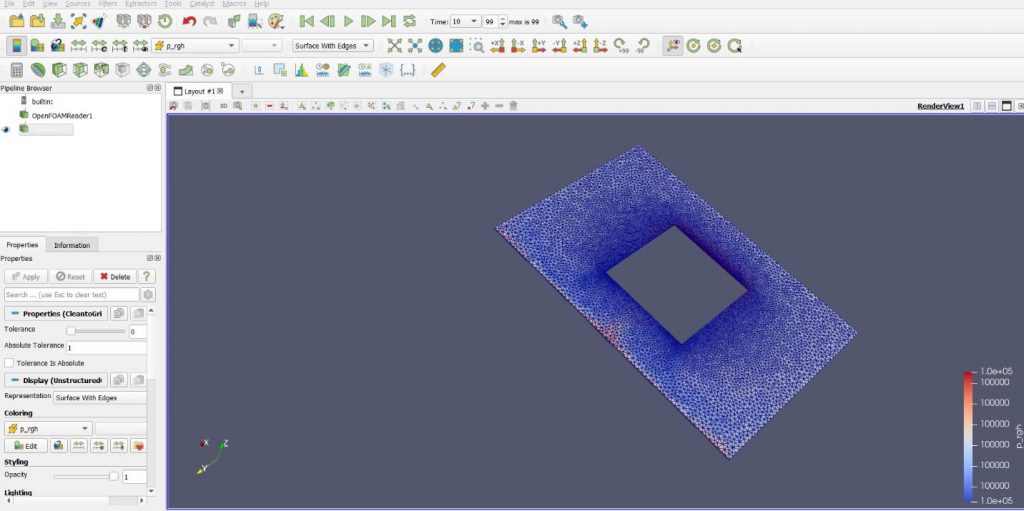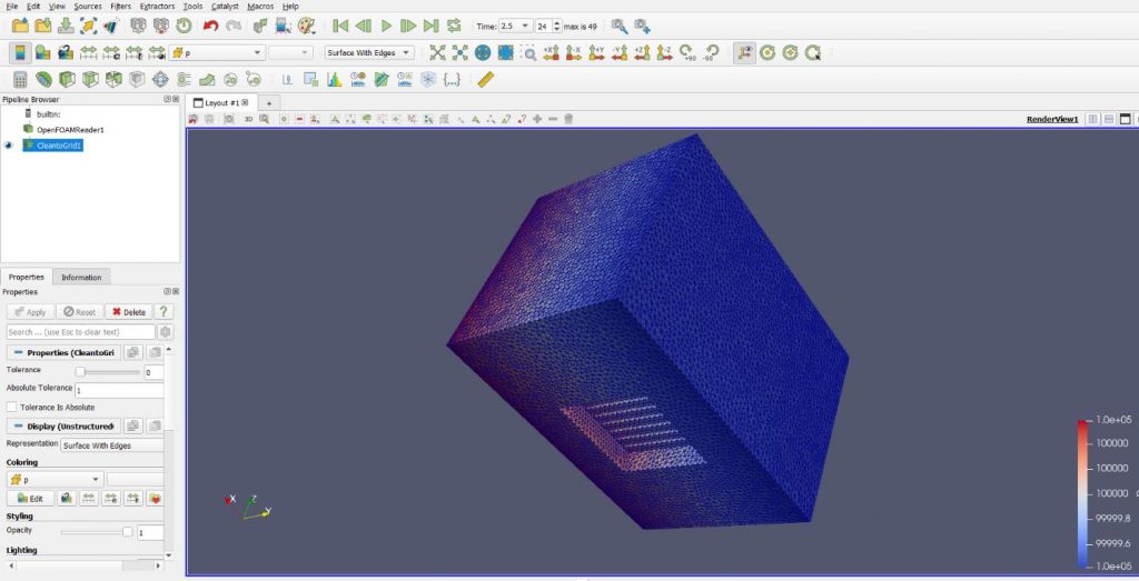 Die Darstellung wurde in ParaView erzeugt. Der Druck liegt im Bereich von 1,0e+05 bis etwa 9,9999e+04 Pa. Das Diagramm zeigt den Druckgradienten sowie den Druckverlust durch die Lamellenstruktur.