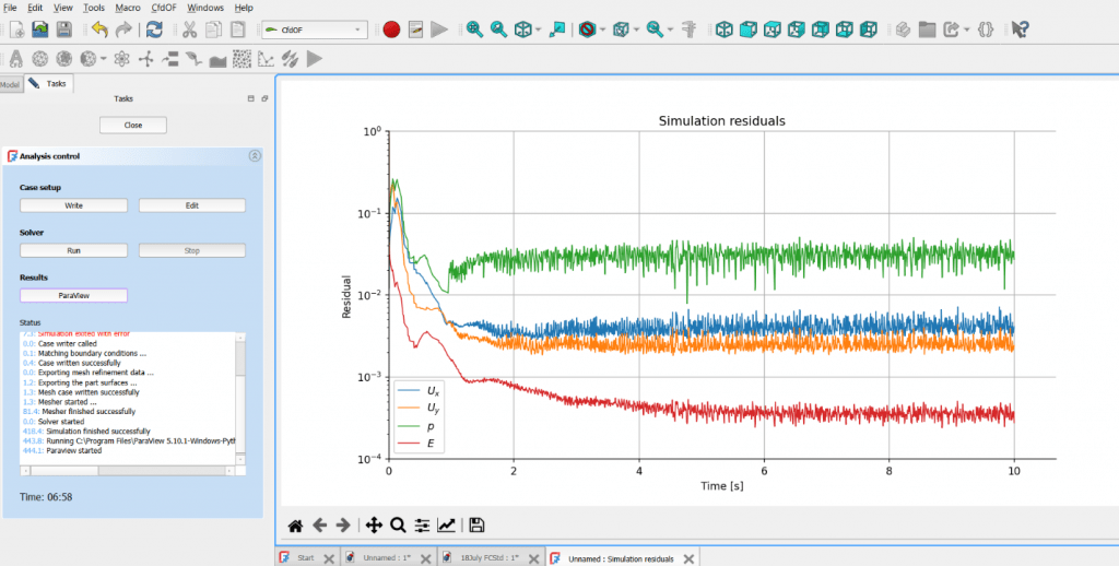 Die Darstellung stammt aus FreeCAD. Das Diagramm zeigt die Entwicklung von Geschwindigkeit, Druck und Energie über die Zeit. Die Residuen sinken deutlich und stabilisieren sich, was die Konvergenz der Lösung bestätigt.
