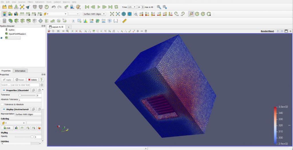 Die Darstellung wurde in ParaView erzeugt. Die Temperatur liegt im Bereich von 290 K bis 370 K.