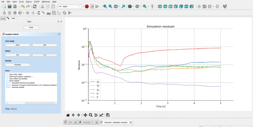 Die Darstellung stammt aus FreeCAD. Das Diagramm zeigt die Geschwindigkeitskomponenten Ux, Uy und Uz, den Druck p sowie die Energie E über einen Zeitraum von 0 bis 5 Sekunden. Die Residuen sinken deutlich und stabilisieren sich, was auf eine weitgehend konvergente CFD Lösung hinweist.