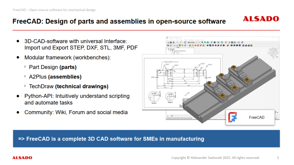 Das erste Webinar zeigte, wie Open Source Software im Engineering eingesetzt werden kann. Dabei wurde klar, dass FreeCAD nicht nur eine theoretische Alternative ist, sondern auch in der Praxis zuverlässig funktioniert.